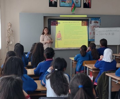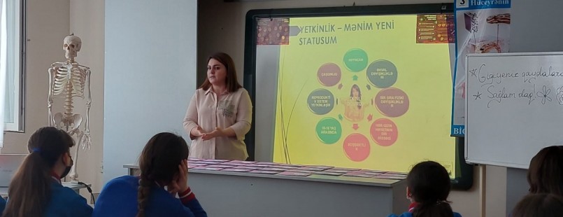 01.03.2022 tarixdə Fizika, Riyaziyyat və İnformatika təmayüllü Respublika liseyinin Biologiya müəllimi İradə Zeynalova “Ümumtəhsil məktəblərinin ümumi orta təhsil səviyyəsində reproduktiv sağlamlığın tədrisi üzrə metodik tövsiyə”yə əsaslanaraq, VIII sinifdə oxuyan qızlara "Reproduktiv sağlamlıq" la bağlı maarifləndirici dərs keçdi. Dərs zamanı müəllim şagirdlərə yeniyetmələrdə psixo-emosional və davranış dəyişiklikləri, Premenstrual sindrom (PMS), gigiyena vasitələrinin necə seçilməsi, yeniyetmələrin qidalanma vərdişləri ilə bağlı məlumatlar verdi, şagirdlərlə fikir mübadiləsi apardı.